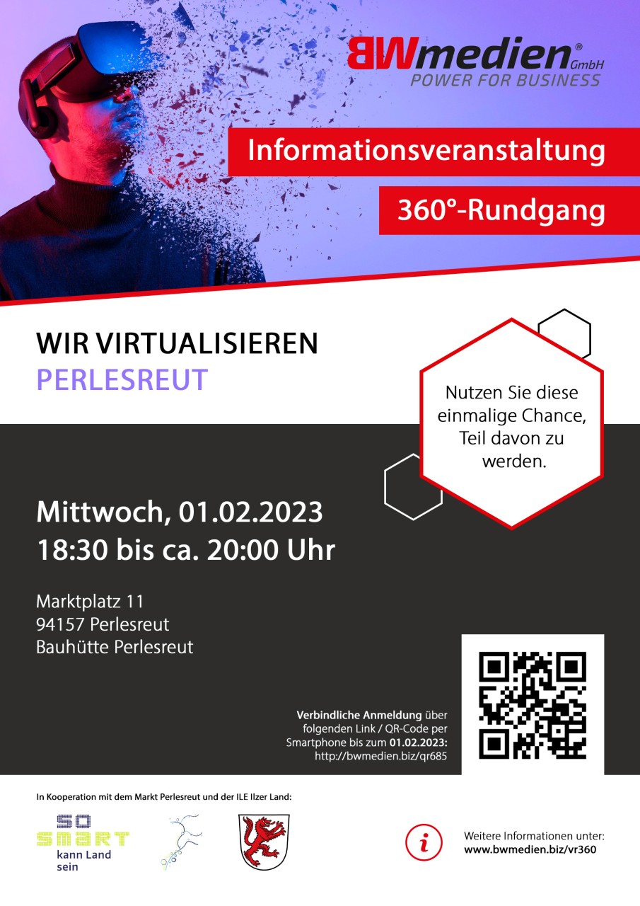Digitalisieren kann auch Spaß machen. Nutzen Sie diese einmalige Chance, Teil davon zu werden. Präsentieren Sie sich attraktiv, interaktiv im virtuellen Perlesreut und wappnen Sie sich für die Zukunft. In Kooperation mit dem Markt Perlesreut sowie mit der ILE Ilzer Land virtualisieren wir die Region. In einer 1,5 Std. Infoveranstaltung erklären wir nicht nur die Technology hinter VR-Touren, sondern zeigen Ihnen, was alles machbar ist und wo bzw. wie man einen virtuellen Rundgang in den verschiedensten Branchen und Marketingstrategien einbinden kann.